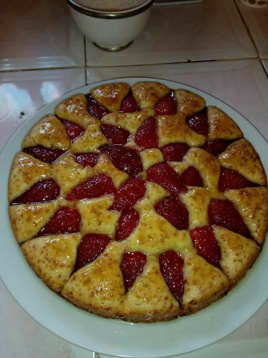تقطع حبات الفريز الى جزئين و يزين به الخليط و ندخل الكيك الى الفرن حتى تنضج و تتحمر