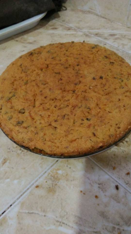 تضاف الحشوة و تمزج مع الخليط ثم يدهن المول بالزبدة و يرش بالسميد و يصب الخليط و تدخل الفرن حتى تتحمر