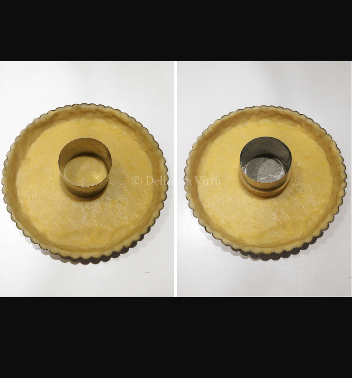 ثم نثقب العجين بالشوكة ونضع فوقها القليل من الحمص كي لا ينتفخ أثناء الطهي