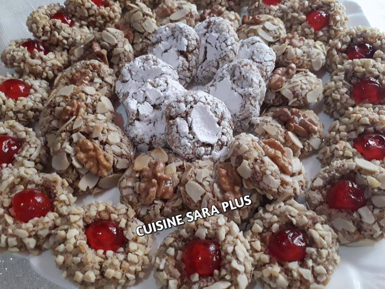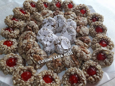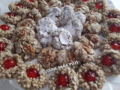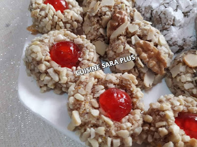 من بعد قسميها كرات في حجم 20غ مرريها في لوز شرائح او لوز concassé او سكر بودرة دخليها الفرن ساخن مسبقا درجة الحرارة °170 مدة الطهي 15 دقيقة مع مراقبتها . صحة وعافية