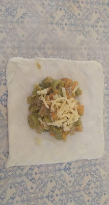 الحشوة: صدر دجاج مقطع صغير مع القليل من الزيت مع بصلتين مقطعين و ملح ثم نضيف 2 حبات من الفلفل مقطعين قطع صغيرة و حبتين جزر محكوك و حبة قرعة محكوكة و عطرية الدجاج و التوابل نحرك الكل على نار هادئة حتى يطهى