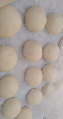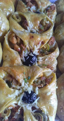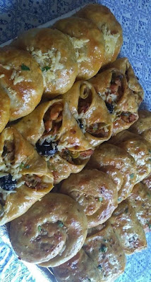 العجين: نصف كيلو دقيق و ملعقة كبيرة زيت المائده و قليل من الملح و السكر و 4غ خميرة الحلوى (يعني نصف كيس) نجمع العجين بالماء الدافئ أو نغطيها بالسلاتيك الغذائي و نتركها ترتاح