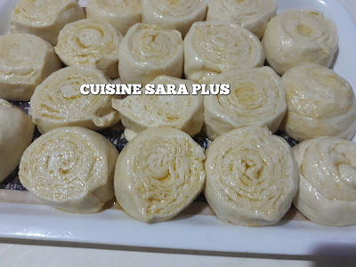 تخلط كل المكونات مع بعض بالماء الدافئ تدلك جيدا حتى نحصل على عجين لين يقسم العجين إلى قسمين يدهن بالزيت و يغطى بالبلاستيك نصف ساعة تقريبا.