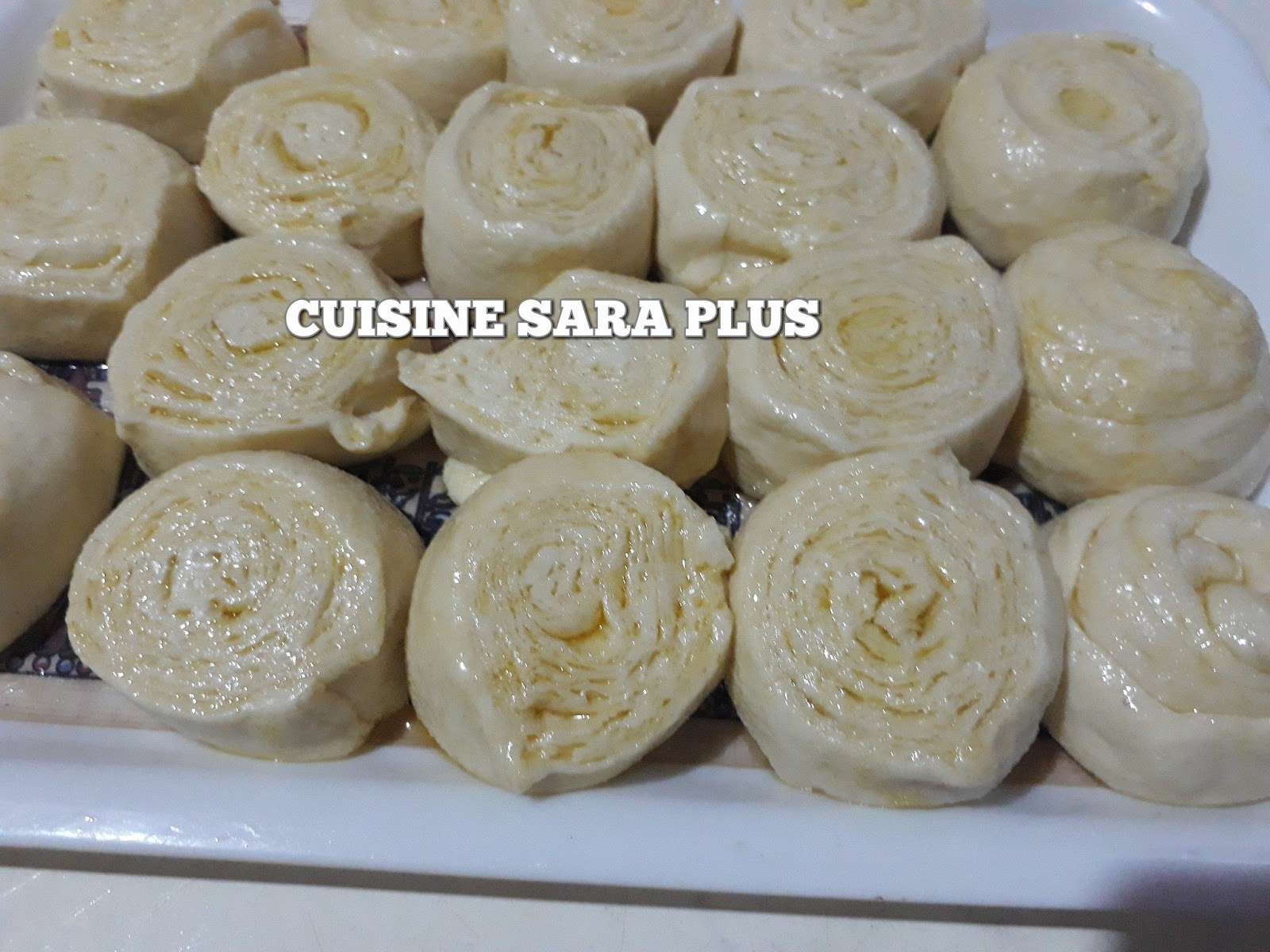 خذي الكرة الاولى بسطيها جيدا فوق طاولة العمل تكون مدهونة بالزيت ، ادهني العجين بالزبدة الدائبة ورشيها بالسميدة ثم تطوى كما هو مبين في الصورة وتقطع تترك ترتاح مرة أخرى يبسط باليد وتطهى من الجهتين في المقلاة تقدم مصحوبة بالعسل وبالهنا