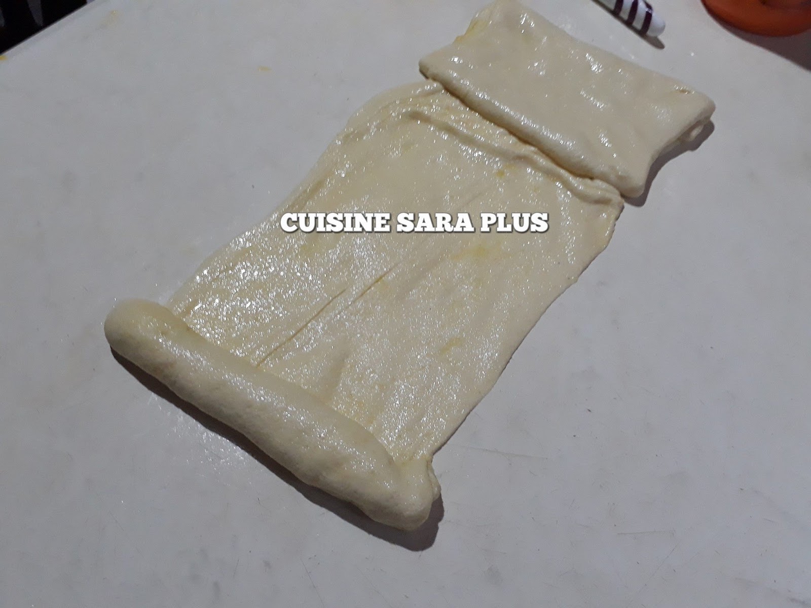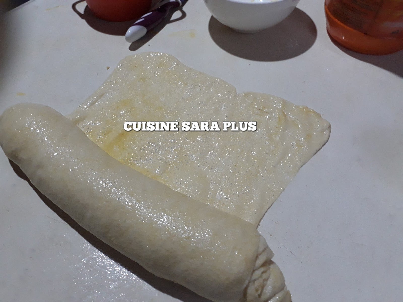 تخلط كل المكونات مع بعض بالماء الدافئ تدلك جيدا حتى نحصل على عجين لين يقسم العجين إلى قسمين يدهن بالزيت و يغطى بالبلاستيك نصف ساعة تقريبا.