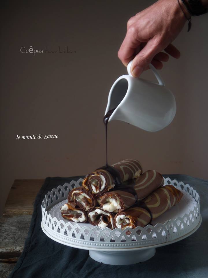 محشو الكريب بالكريمة و نضع خيوط من الكراميل نلف الكريب ثم نزين بصلصة الشكلاطة