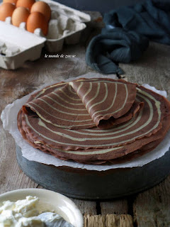 بعدها نضيف الزبدة و نخلط مرة ثانية نضع المزيج في إناء و ناخذ منه كمية قليلة نضيف الكاكاو لمزيج الكريب و نحرك جيدا