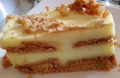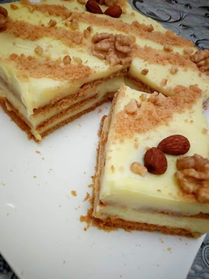 تم نضع كدالك طبقة بيسكوي ونعاود نفس شيء يعني طبقة من البسكوي و طبقة من كريم باتسيير ثم نتركها لتبرد جيدا ونزين باي شيء زينت بالبيسكوي مطحون مع قليل من كركاع ولكم الاختيار وبالصحة