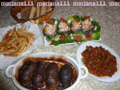 و ها الطحال ديالنا مرفوق بالسلطات و الفريت و خبز الدار.