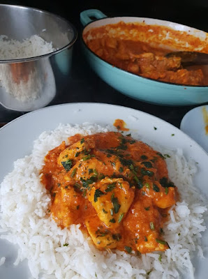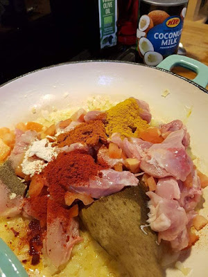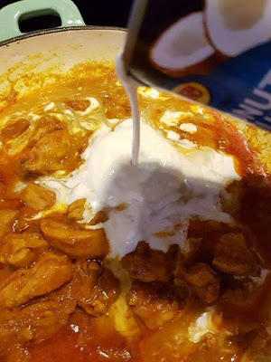 بعد أن يطهى الدجاج يصب حليب جوز الهند ويترك فوق النار المتوسطة حتى بتشرب