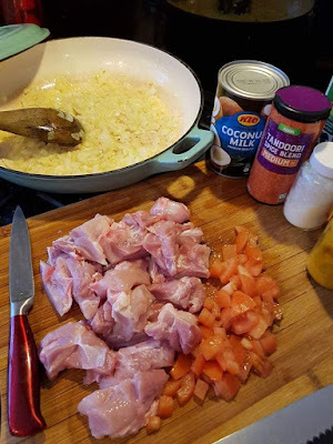 يشوح البصل مع زيت الزيتون و الطماطم يظاف الدجاج+ التوابل