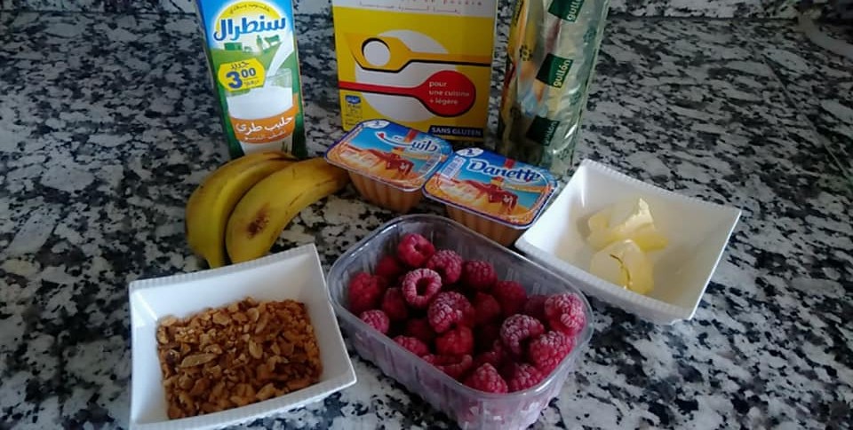 في كؤوس نضع طبقة موز وطبقة ديال بسكوي وكاوكاو وطبقة خليط حتى كنساليو والى ثلاجة وبصحة وراحة Cuisine Majdolin