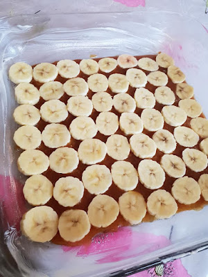 في قالب الكيك مدهون بالزبدة نصب الكراميل بعد تحضيره و نصفف فوقه الموز كما في الصورة