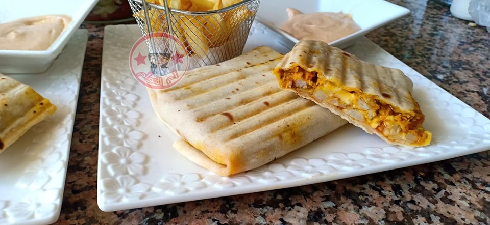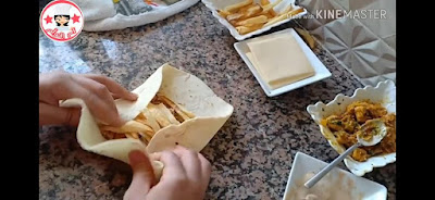 ناخذ خبز الطاكوس نضع فوقه الصلصة ثم الحشوة ثم جبن السندويش ثم البطاطس المقلية