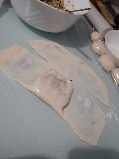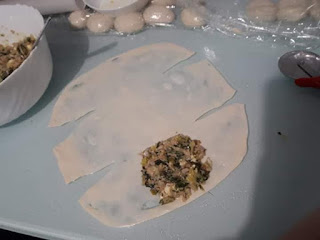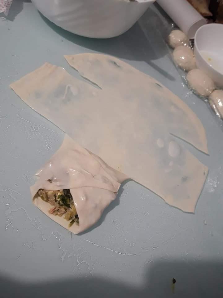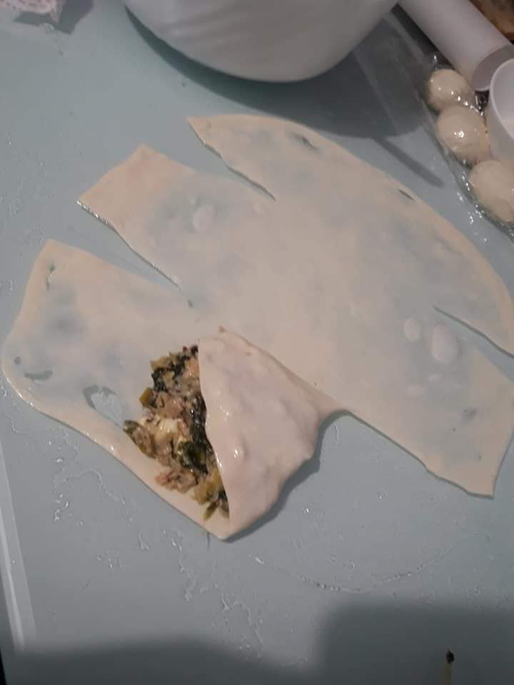 في مقلة نشحر 2 بوارو مقطعين رقاق و بصلة مشلظة مع زيت بلدية و ملعقة زبدة ملح ابزار حتى يتشحر ونضيف 250غ سبانخ مقطعين و 2علب تونة مصفاة من الماء أو الزيت و خارج النار نضيف نصف علبة جبن و 100غ من جبن متزاريلا