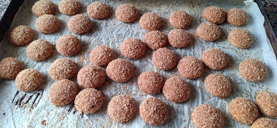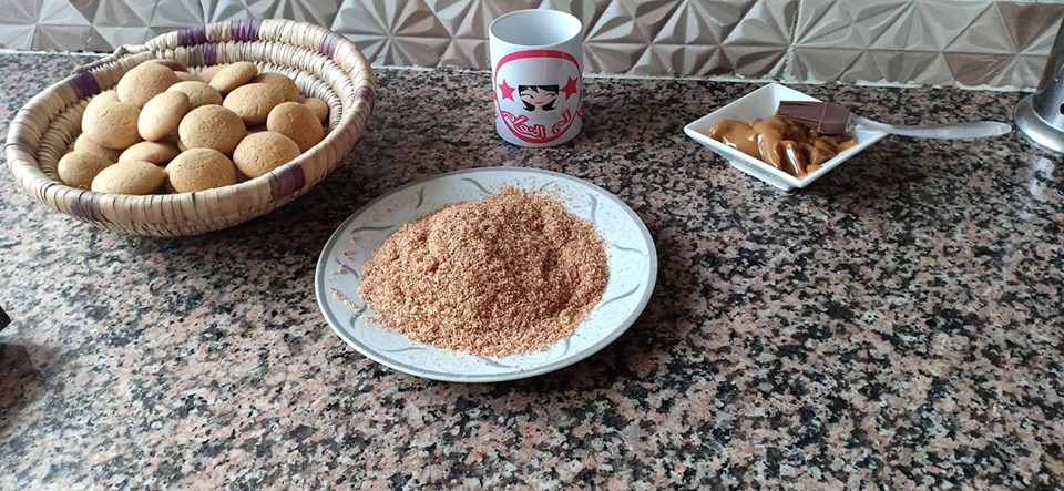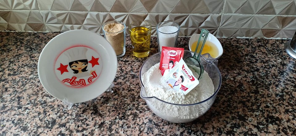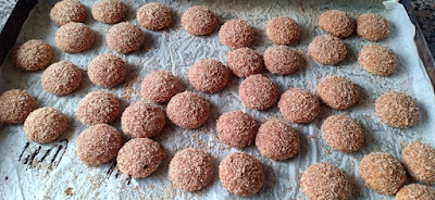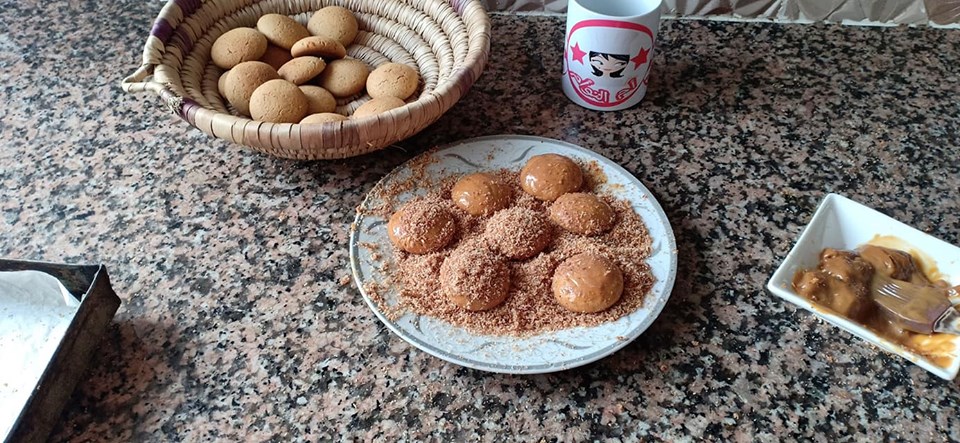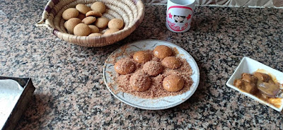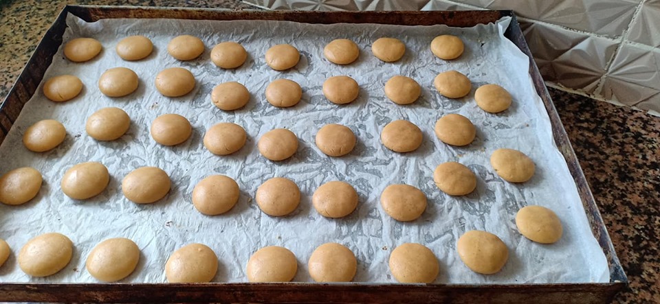 تخلط كل المكونات مع بعض حتى تتجانس مع اضافة الدقيق شيئا فشيئا حتى الحصول على عجين متماسك نشكل منه كويرات كما في الصورة و ندخل الحلوة للفرن
