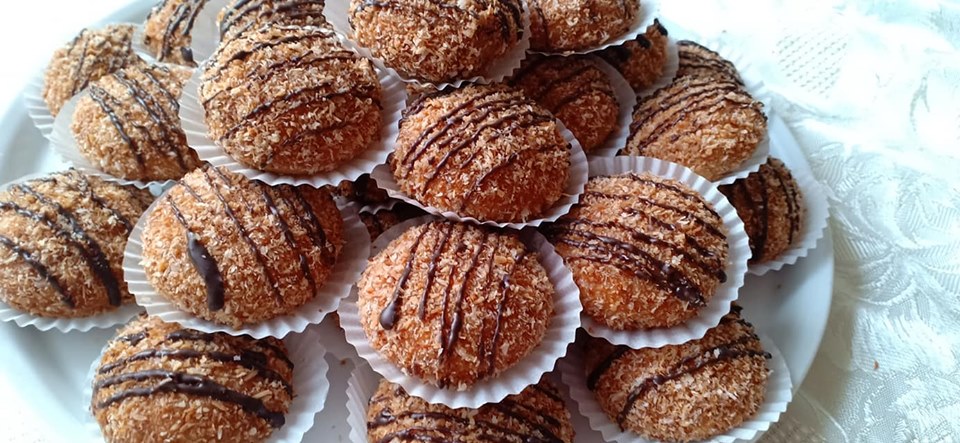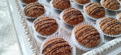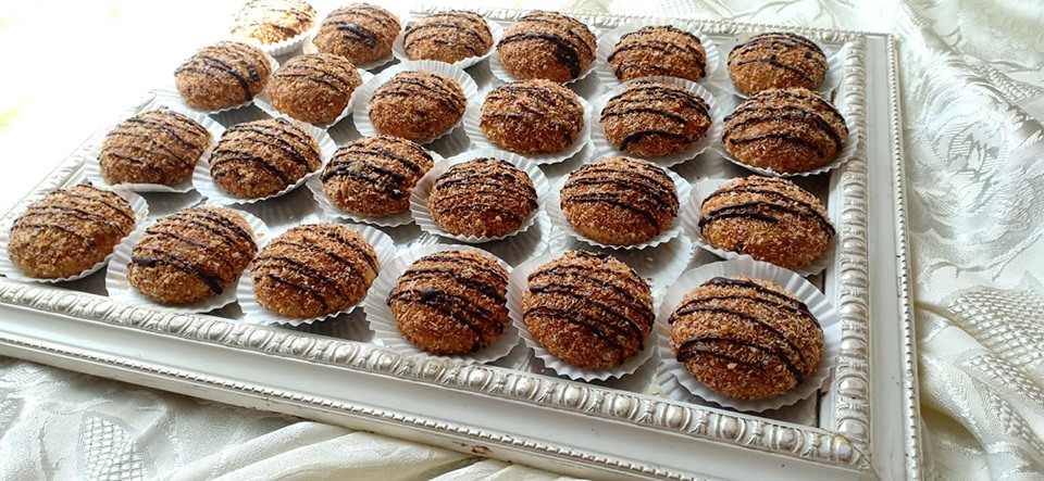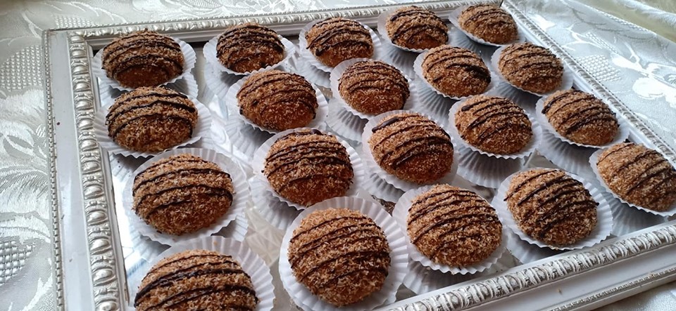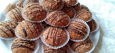 بعد ان تستوي نخرجها من الفرن و ندهنها بالكراميل و نمررها في الكوك المحمر اي جوز الهند المحمر