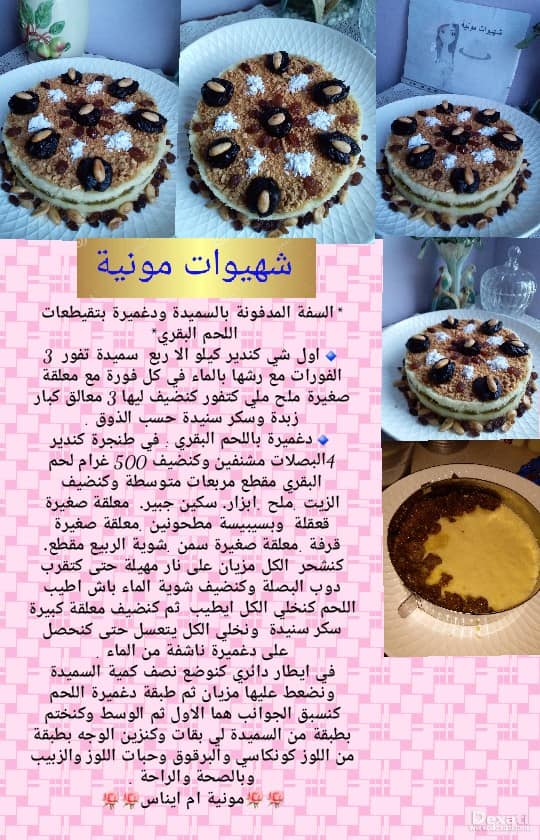 اطباق عيد الاضحى • منوعات السفة المدفونة بالسميدة والدغميرة بلحم البقري Add Comment السلام عليكم حبيباتي نقدم ليكم اليوم شهيوة تقليدية السفة المدفونة بالسميدة والدغميرة بلحم البقري وبالصحة والراحة والمقادير والطريقة مع الصور باش اسهال عليكم تحتافضو بالمقادير.