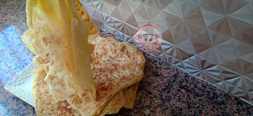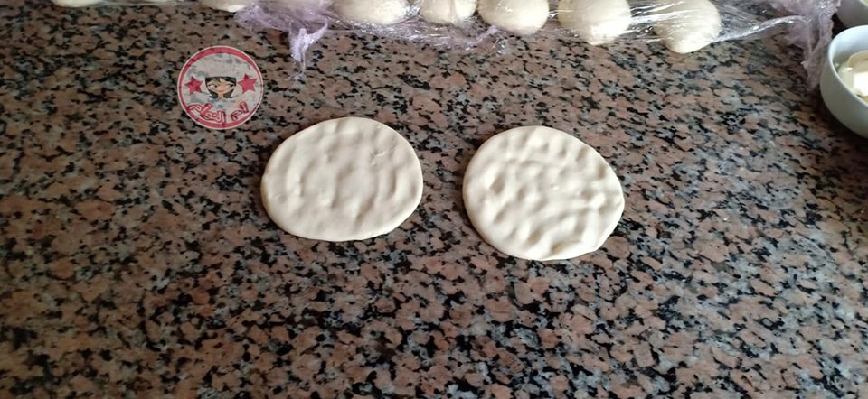 ناخذ 2 كرات نبسطهم قليلا ندهن واحدة بالزبدة و نرش فوقها الدقيق او السميد و نضع فوقها الاخرى