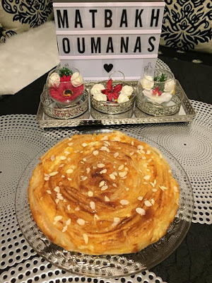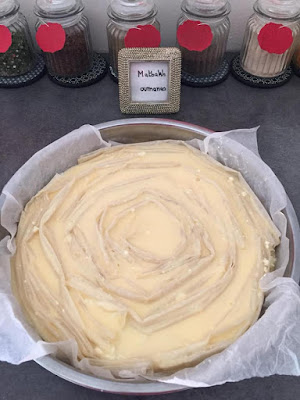 يدهن ورق الفيلو بالزبدة المذابة ونضع الجبن في كيس بلاستيكي ونضع خط من الجبن مثل لمحنشة ثم يلف الورق الفيلو على الجبن ثم يطوى على شكل كما تلاحظون في الصورة ويوضع في وسط القالب مغلف بالورق الطهي ثم نستمر هكذا حتى نهاية الورق الفيلو والجبن وتحصل على شكل يشبه المحنشة ثم في خلاط كهربائي نضع البيض وملعقتين من الجبن والفاني والخميرة الكميائية والسكر وقبصة ملح والياغورة والزيت والحليب ونخلط الكل جيدا ثم يوضع بالتساوي فوق الورق الفيلو المحشي بالجبن ويساعد بوسطة ملعقة لكي يدخل الخليط بين الورق الفيلو ثم يوضع القالب في الصينية الفرن ويوضع في الفرن على 175 نار من تحت فقط بالنسبة للفرن الكهربائي حتى يطهى ويتحمر يدهن بالعسل ويرش برقائق اللوز وتقدم بالصحة والعافية.