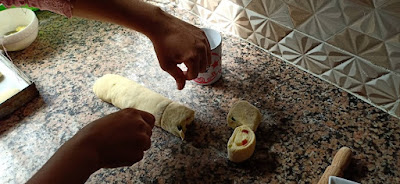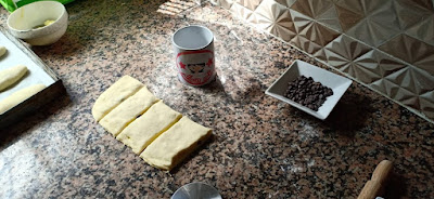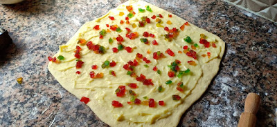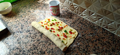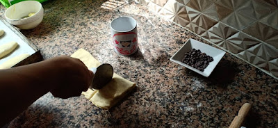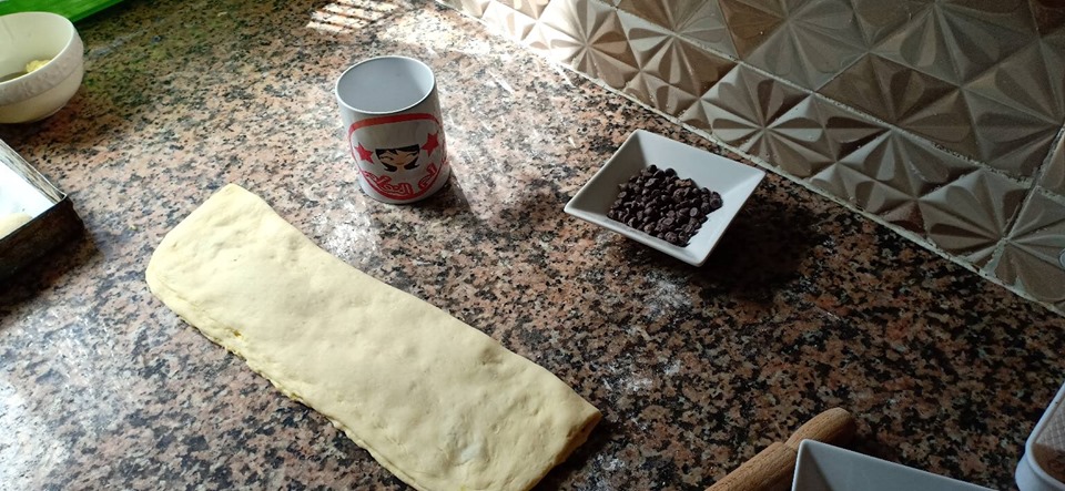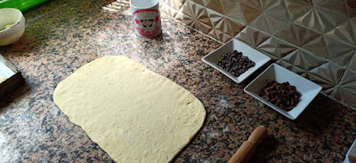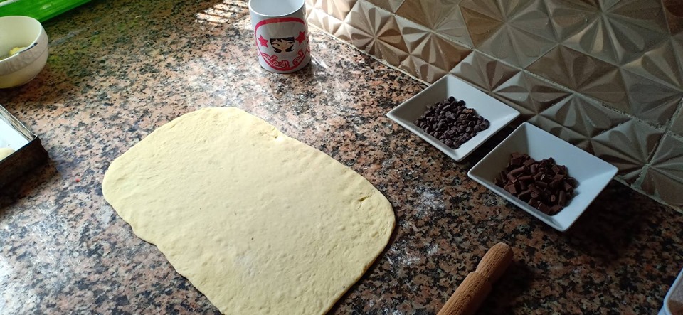 نبسط العجين ندهنه بكريم باتسيير و نرش الفواكه المعسلة