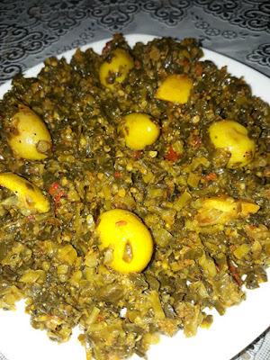 في مقلاة نحضر الشرمولة لي فيها التوابل : ملح ابزار خرقوم تحميرة كامون و زيت الزيتون القزبر و معدنوس و نمعكو الثوم لي تبخر مع الرجلة الهريسة الزيتون الحامض مصير و نضيفو الرجلة نقليو الكل مزيان و بالصحة و الراحة