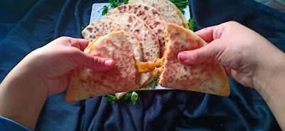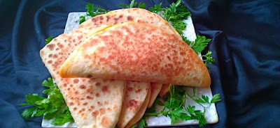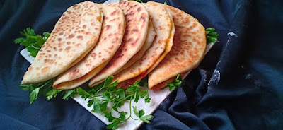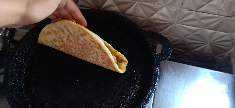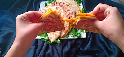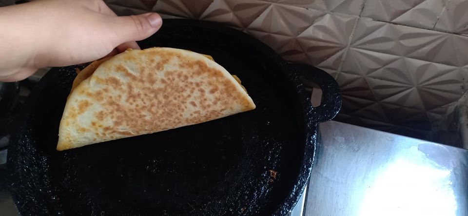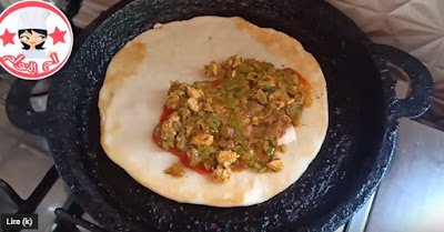 نتركها لبضع ثواني و نقلبها و نضع الحشوة ثم الجبن