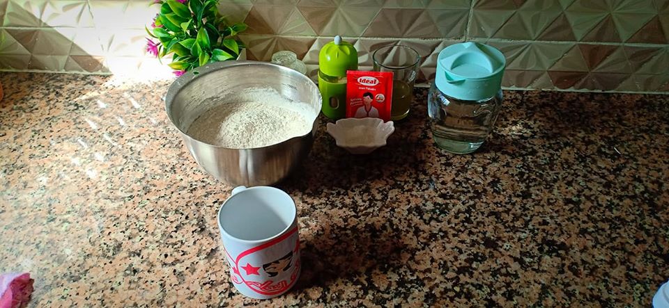 تجمع مكونات العجين و تدلك جيدا و نتركها لتختمر