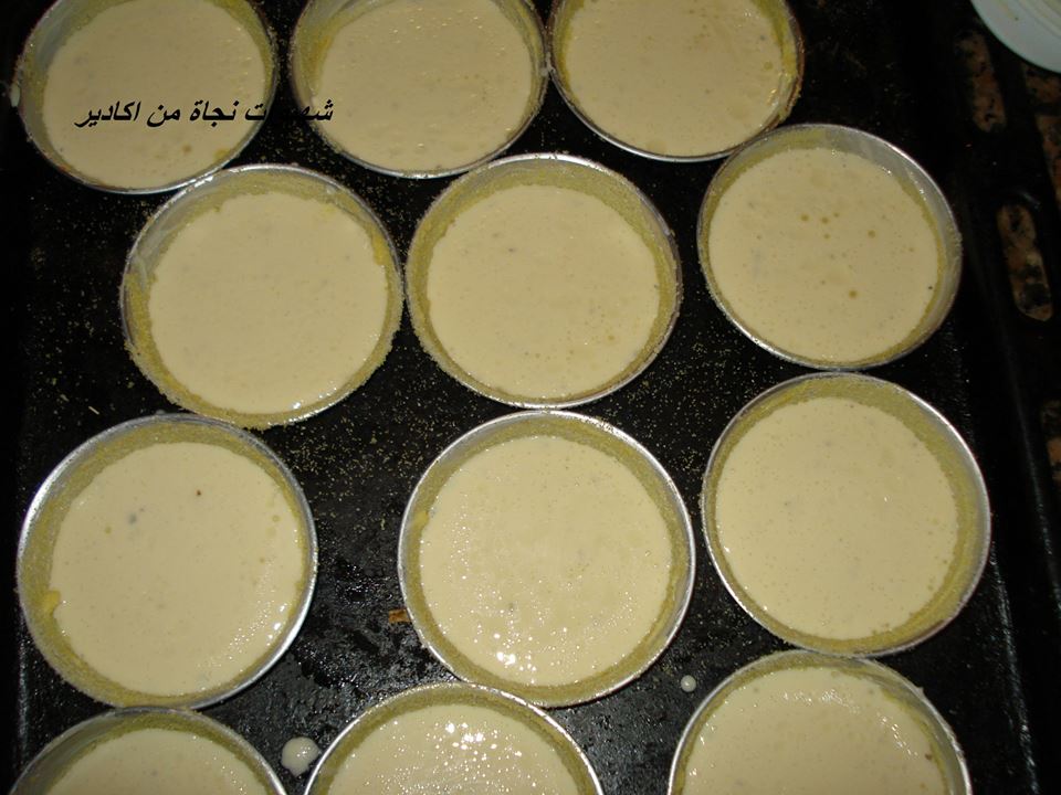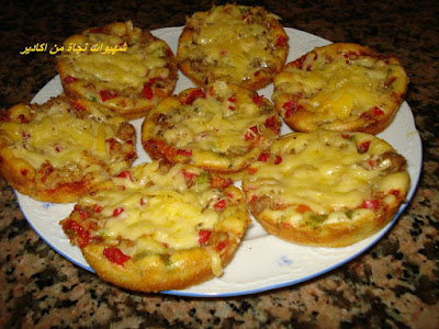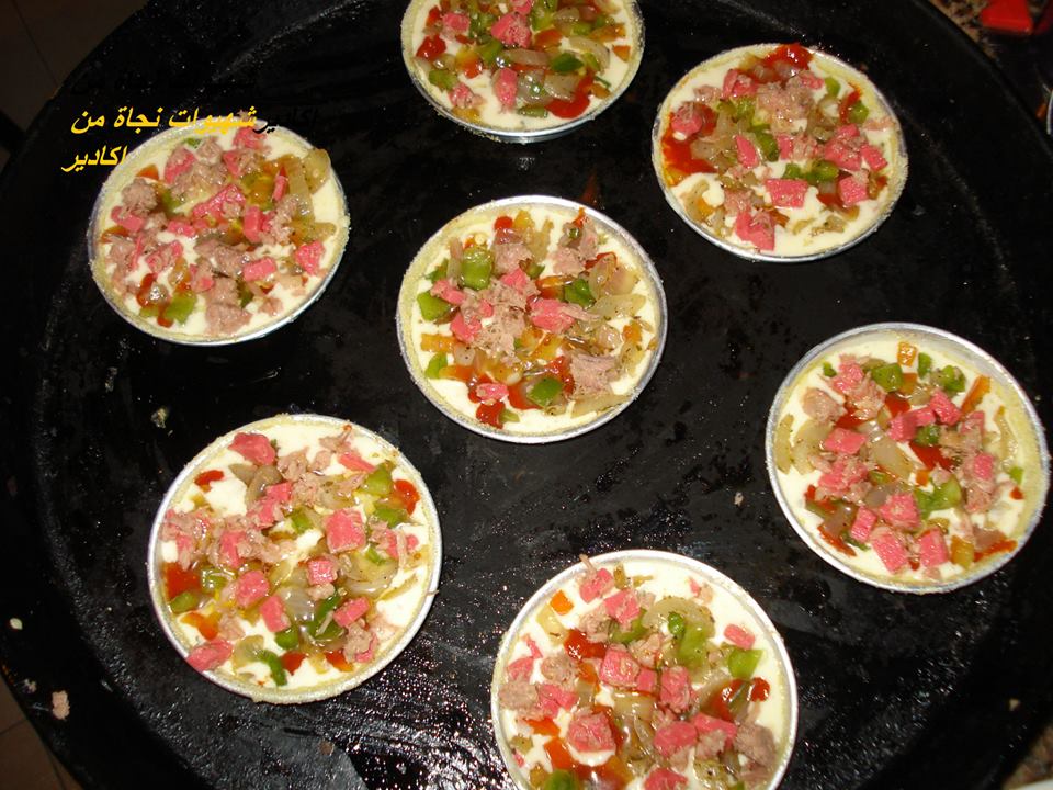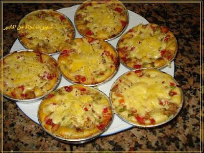 نخلط كل مكونات البيتزا السائلة و نصبها في قوالب فردية مدهونة او في قالب كبير