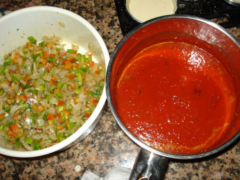 نأخد مقدار من لصوص لبيتزا.أولكيتشاب.بصلة مقطعة رقيق مربعات ومشحرة في قليل من الزيت مع ملح لبزار. نأخد فلفلة خضرة حلوة نقطعها رقيقة نضعها جانبا.