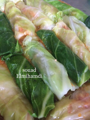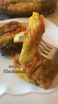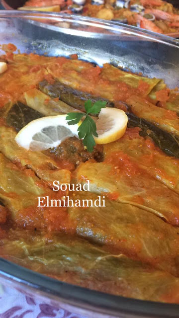 ثم ندوزو للحشوة : زلافة كفتة، زلافة روز عادي مسلوق ،معلقة كبيرة مطيشة الحك،ملعقة هريسة حارة،بصلة و مطيشة مشلضين رقيق، والتوابل ملح ابزار خرقوم سكنجبير كمون تحميرة نخلط كلشي وناخد الأوراق نقسمها على اثنين ونتخلص من العظم لي فالوسط ونبدا نعمروه بالحشوة بحال السيكار ونعملوه في قالب لي نكونو حطينا التحت صوص طماطم(أي صوص معتمدة عندكم) ونستفوهوم مزيرين ما أمكن باش مكيتحلوش ونضغطو عليهم بشي حاجة ثقيلة وندخلوهوم الفران حتى يطيبو ونقدموهوم بالصحة والراحةsound Elmihamd