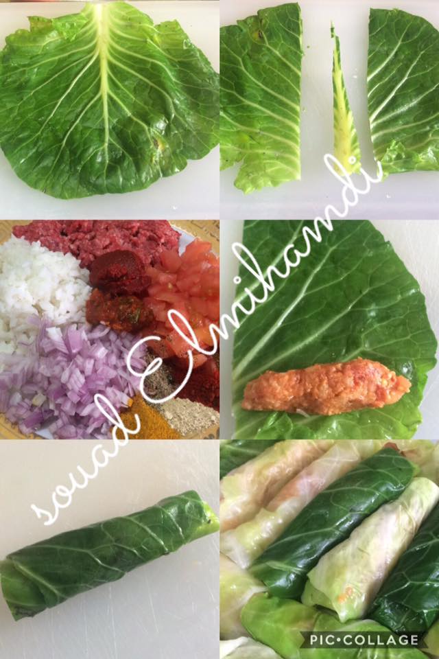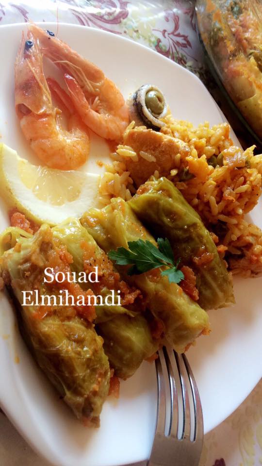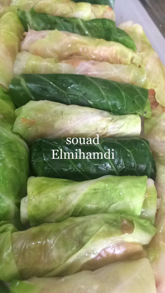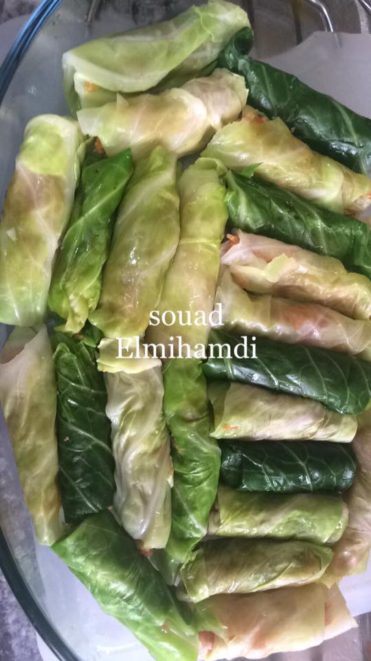 ثم ندوزو للحشوة : زلافة كفتة، زلافة روز عادي مسلوق ،معلقة كبيرة مطيشة الحك،ملعقة هريسة حارة،بصلة و مطيشة مشلضين رقيق، والتوابل ملح ابزار خرقوم سكنجبير كمون تحميرة نخلط كلشي وناخد الأوراق نقسمها على اثنين ونتخلص من العظم لي فالوسط ونبدا نعمروه بالحشوة بحال السيكار ونعملوه في قالب لي نكونو حطينا التحت صوص طماطم(أي صوص معتمدة عندكم) ونستفوهوم مزيرين ما أمكن باش مكيتحلوش ونضغطو عليهم بشي حاجة ثقيلة وندخلوهوم الفران حتى يطيبو ونقدموهوم بالصحة والراحةsound Elmihamd