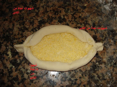 نخلط جميع لعناصرنجمعها بالماء دافي ندلكها مزيان.نتركها تخمر في مكان دافئ .ثم نقسم لعجينة إلى 6 أو8كريصات (إلى بغيتيهم كبار بحال دياولي قسمي لعجين على6 ) ولاستعملتيهم صغارميمكنش تستعملي لبيض عادي خاصك تستعملي بيض السمان في لحشو.