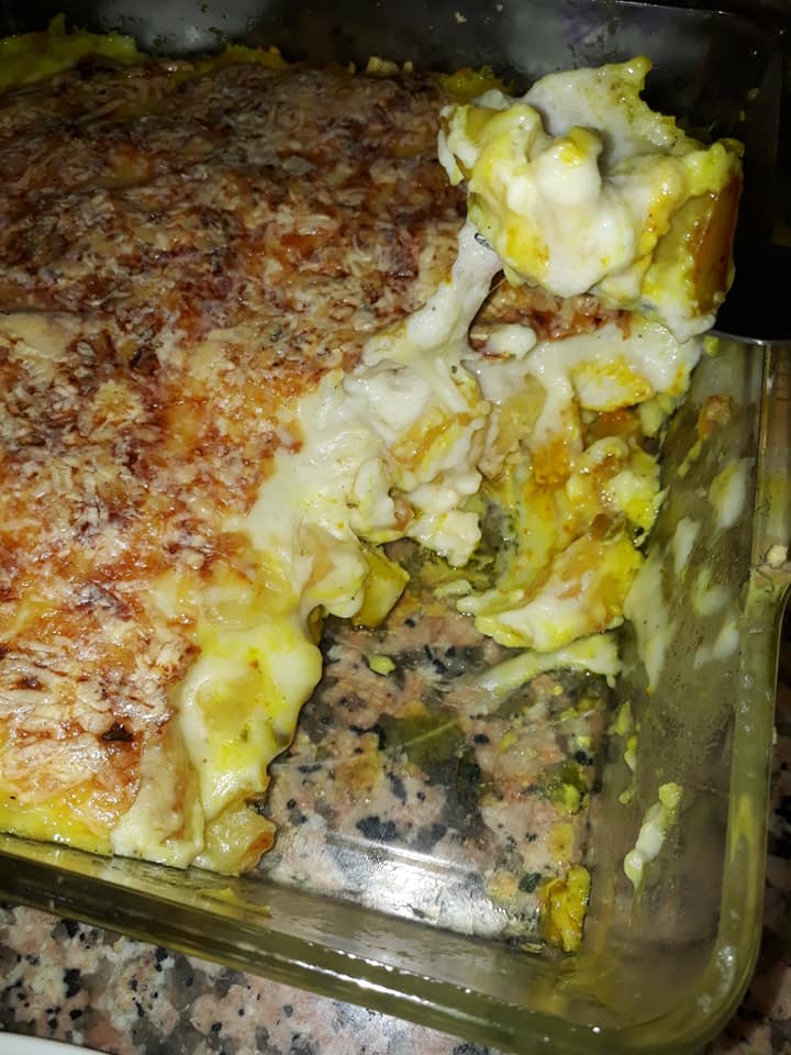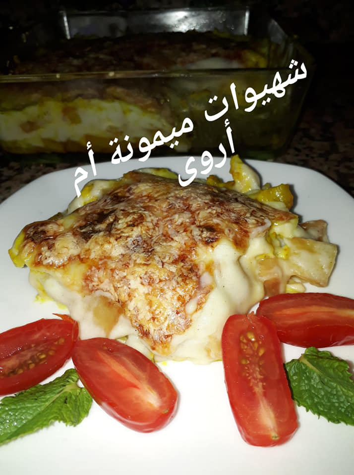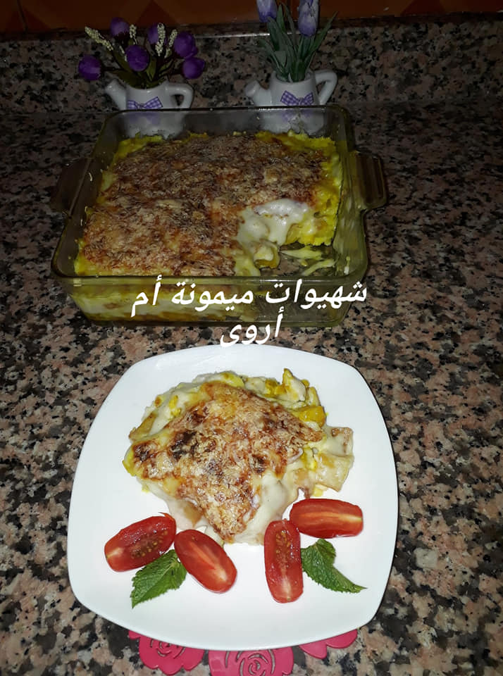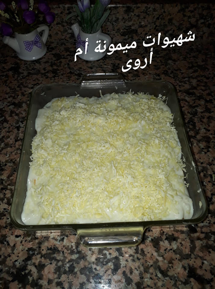 مرة اخرى صلصة البيشاميل ونرش الوجه بالفرماج محكوك وندخل الكراتان للفرن