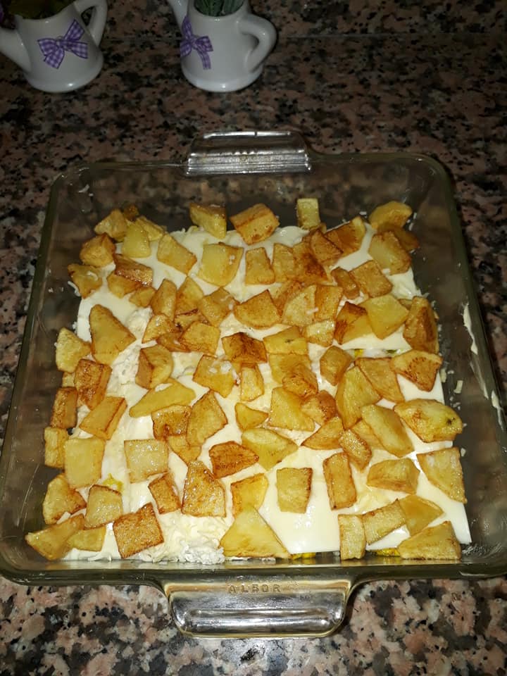 ندهن القالب بالزبدة نضع فيه بطاطس مقطعة مربعات ومقلية