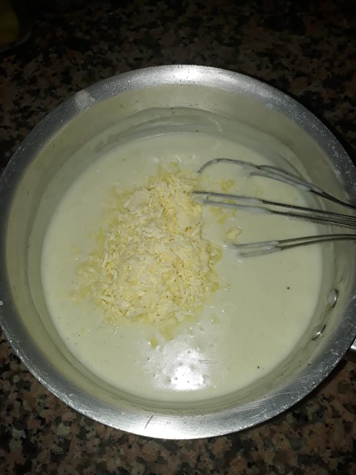بالنسبة بيشامل : في كسرونة نضع معلقة كبيرة زبدة بعد ان تذوب نضيف لها معلقة كبيرة ونص دقيق نخلط جيدا ثم نضيف نصف لتر حليب رشة ملح القليل من الابزار نستمر في التحريك حتى يعقاد ونضيف لها القليل من فرماج محكوك