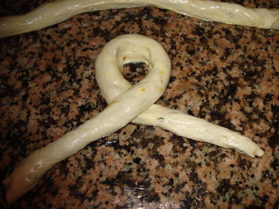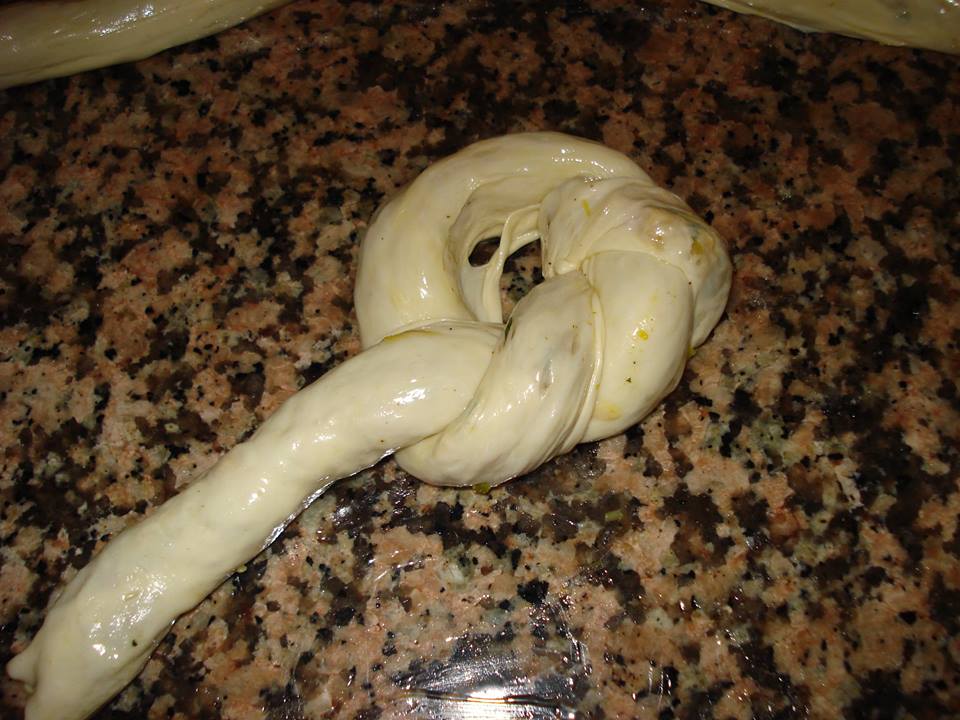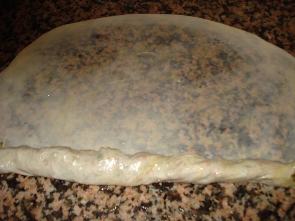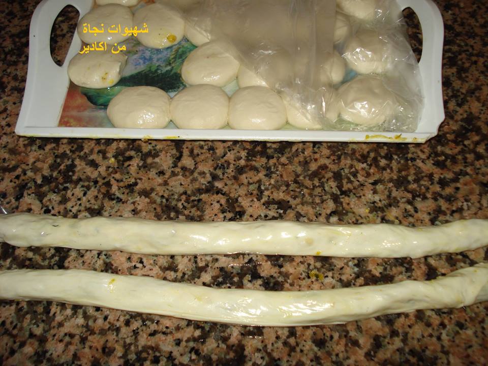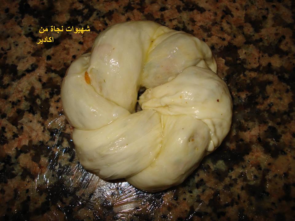 نخلط كل مكونات العجين تكون قاصحة شوية على عجينة لمسمن ندلكها ثم ندهنها بالزيت نغطيها بالبلاستيك الغدائي تقريبا ربع ساعة