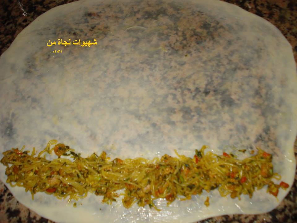 نأخد لكريصة ونسرحها بالمنكرين مع زيت تكون رقيقة .ثم نضع لحشوة في لجانب
