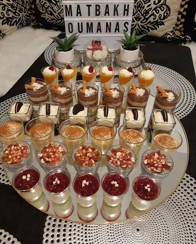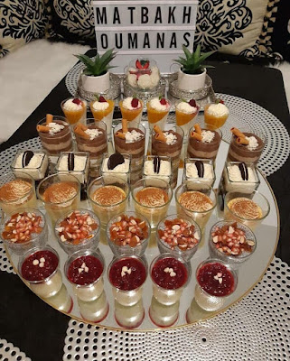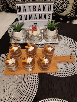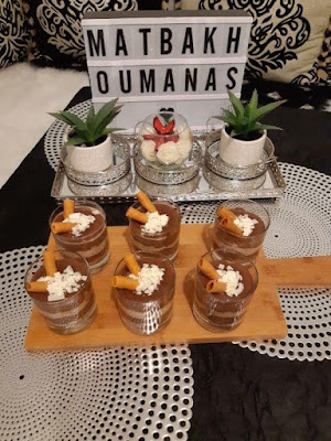 ثم يوضع فوقه مباشرة على سطح الكريمة بلاستيك غذائي حتى تبرد قليلا عندما تبرد نضع ملعقة كبيرة من البيسكوي مريا مطحون في قاع كل كأس ثم نضع فوقه ملعقة كبيرة من الحليب ثم نضع طبقة من الكريمة ثم طبقة من البيسكوى وفوقه ملعقة من الحليب حتى النهاية نضع بيسكوي سيكار مقطع نصفين الشوكلات أبيض مبشور ويوضع في الثلاجة يبرد ويقدم بالصحة والعافية.