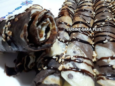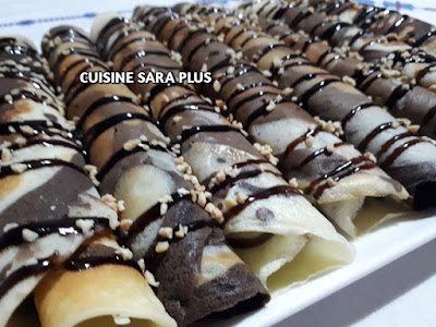 في إناء زجاجي نخلط 4 بيضات ، رشة ملح 80غ سكر ، فانيلا ، ملعقتين كبيرتين زيت المائدة ، 250غ دقيق منخول نضيف نصف لتر حليب بالتدريج . نقسم الخليط إلى قسمين الأول نضيف له ملعقتين كبيرتين كاكاو مر والثاني يبقى على حاله . نغطي الخليطين بمنديل ويترك في الثلاجة لمدة نصف ساعة .