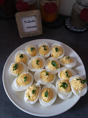 بيض مسلوق ثم أخذت الصفار البيض اضفت له ملعقة من المايونيز وملعقة من الجبن الدهن خلطت الكل مع بعض جيدا ثم وضعته في جيب حلاواني وعمرت به البيض