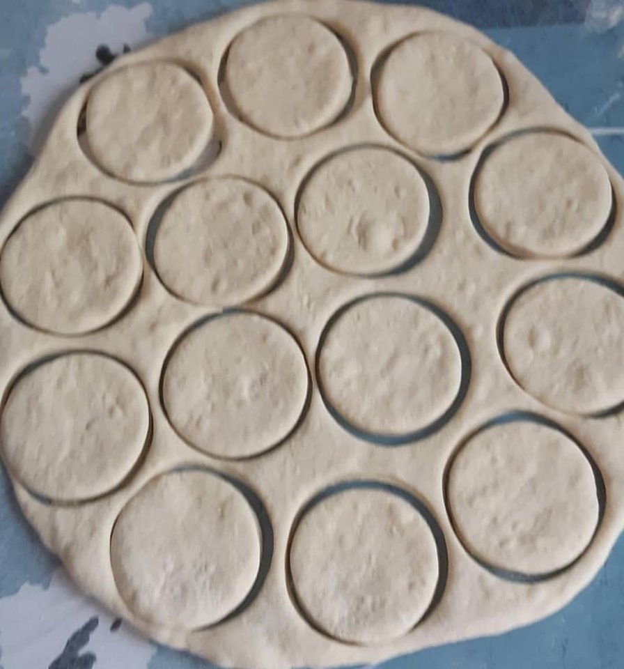 من بعد نقسم العجينة لكرتين و نسرح الكرة الأولى و نشكل دوائر بقطاعة كما في الصور و نتركهم يرتاحوا لمدة 20 دقيقة و يطهو في مقلاة تقيلة