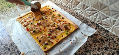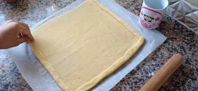 تجمع مكونات عجين الفطائر و تبسط بالمدلك على شكل مستطيل