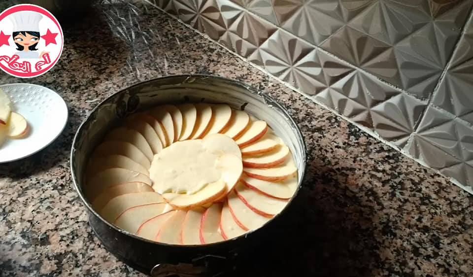 نقطع التفاح الى شرائح و نصففها فوق خليط الكيكة و ندخلها للفرن