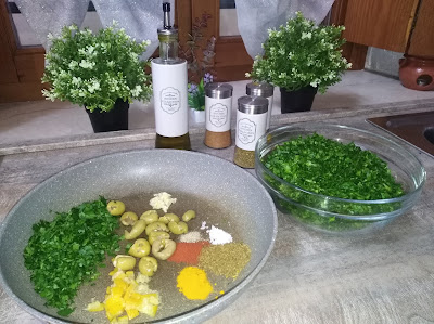 في مقلاة نضع المعدنوس الثوم الزيتون منزوع العظم حامض مصير