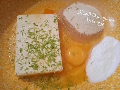 نخلط الحليب مع بياض بيضة ثم نضيف نصف كمية سكر الناعم نخلط و نضيف عصير الليمون ثم نضيف النصف الاخر من سكر و نضيف قطرات من عطر الليمون