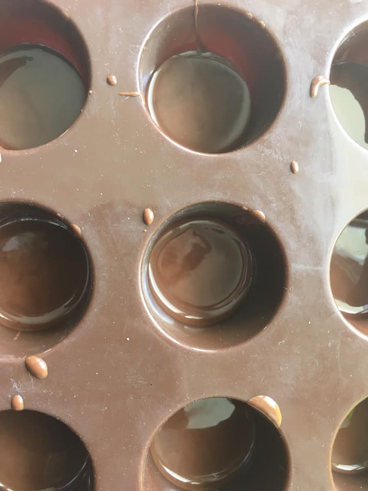 توضع نصف ملعقة من الشوكولاطة المذابة في كل قالب سيليكون