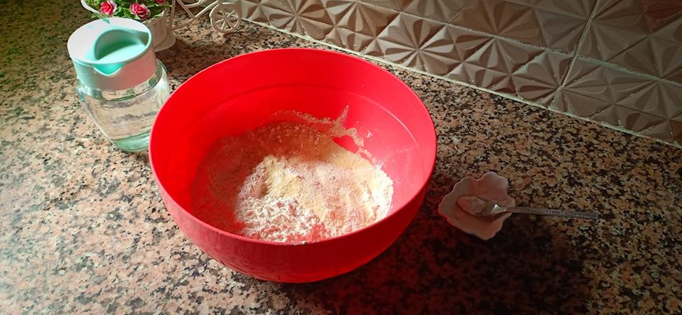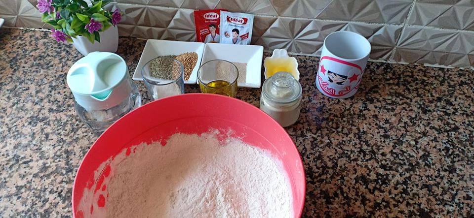تجمع كل مكونات العجين و تدلك جيدا مع اضافة الماء بالتدريج تكون العجينة رطبة و تلتصق قليلا باليد