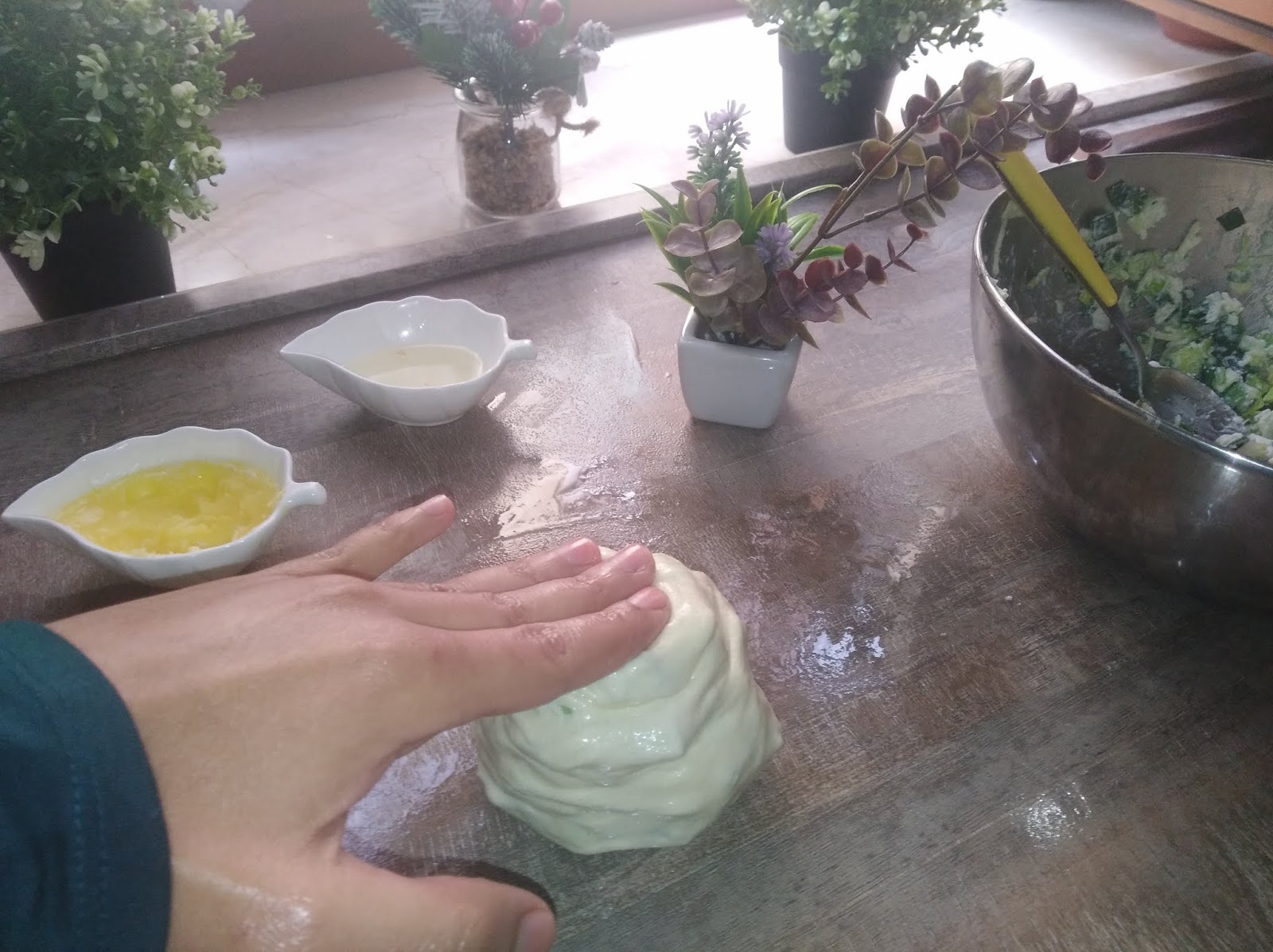 نبسط عجين الملوي و نضع فتحة بالسكين كما في الصورة