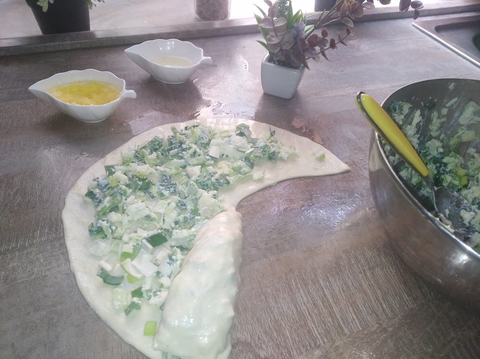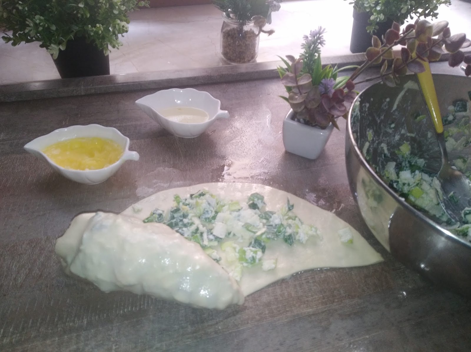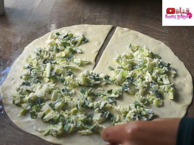 نضع الحشوة بالتساوي فوق عجين الملوي